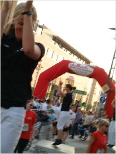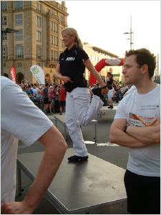 Unsere Trainerin Anne war auch dabei. Nicht als Läuferin, denn sie hatte die besondere Ehre, die Starter vor dem Rennen mit einer kurzen Einheit zu erwärmen. Auf der Bühne inmitten der 7000 Starter löste sie diese Aufgabe gewohnt souverän und, wie immer, mit einem motivierendem Lächeln.